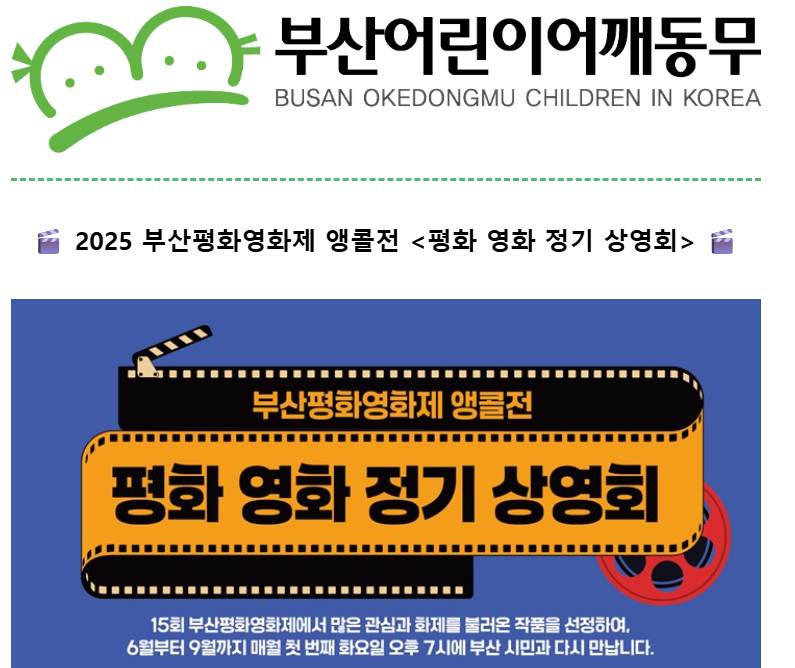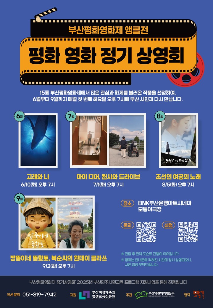 ✅ 일시 및 상영작1회차 - 2025년 6월 10일(화) 19:00 <극장판 고래와 나>2회차 - 2025년 7월 1일(화) 19:00 <마이디어>, <천사와 드라이브>3회차 - 2025년 8월 5일(화) 19:00 <조선인 여공의 노래>4회차 - 2025년 9월 2일(화) 19:00 <짱뚱이네 똥황토>, <복순씨의 원데이 클라쓰>