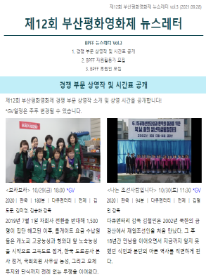 2) 온라인 서포터즈 ▷하는 일: 개인SNS 부산평화영화제 관련 게시물 업로드 ▷활동 기간: 10월 20일(수)~11월 7일(일) ▷활동 장소: 부산 중구 BNK부산은행 아트시네마 모퉁이극장 ▷신청 기간: ~ 10. 17.(일) 자정까지 |