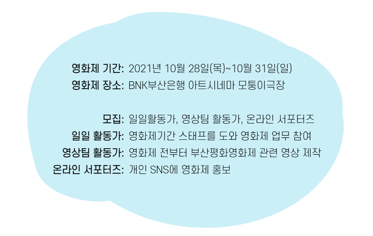 1) 일일활동가 ▷하는 일: 영화제 기간 스태프를 도와 영화제 업무 참여 ▷활동 기간: 10월 28일(목)~10월 31일(일) ▷활동 장소: 부산 중구 BNK부산은행 아트시네마 모퉁이극장 ▷신청 기간: ~ 10. 17.(일) 자정까지