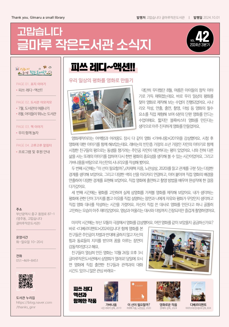 부산 중구청으로부터 작은도서관 두 곳을 수탁 운영하며, 도서관을 기반으로 지역 주민과 평화의 가치를 나누고 더불어 사는 공동체를 가꿉니다.